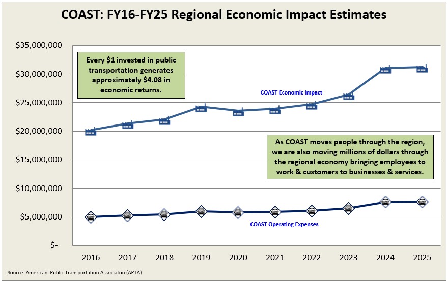 COAST's annual local economic impact in FY24 is estimated at $31 million. This figure includes COAST's direct, indirect, and induced effects on spending, as well as the economic impact of access provided by our services.