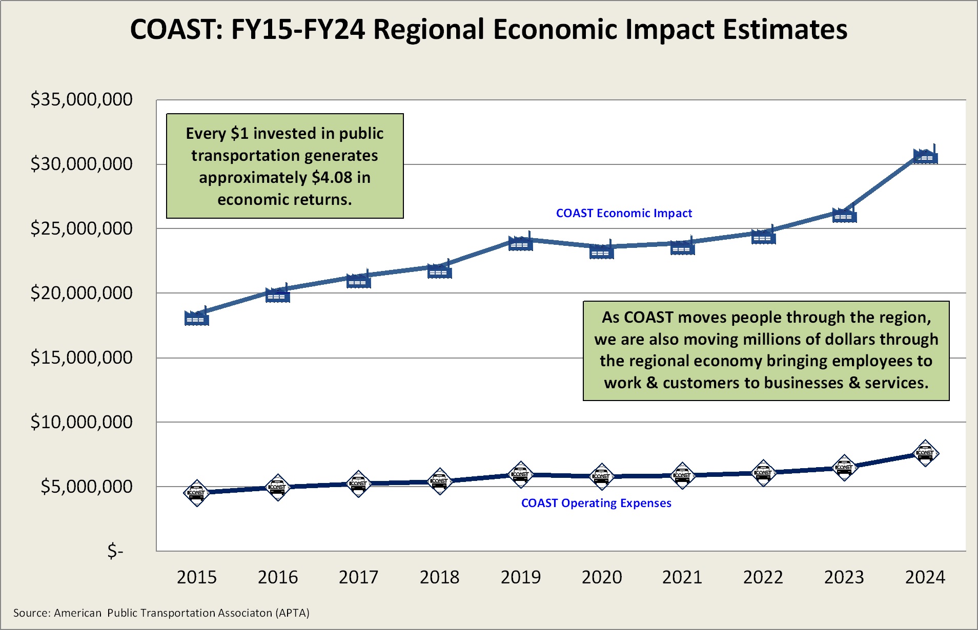COAST's annual local economic impact in FY24 is estimated at $31 million. This figure includes COAST's direct, indirect, and induced effects on spending, as well as the economic impact of access provided by our services.